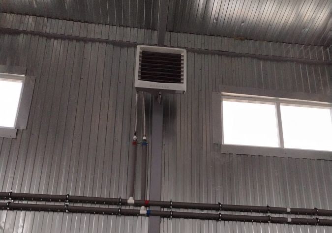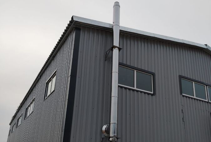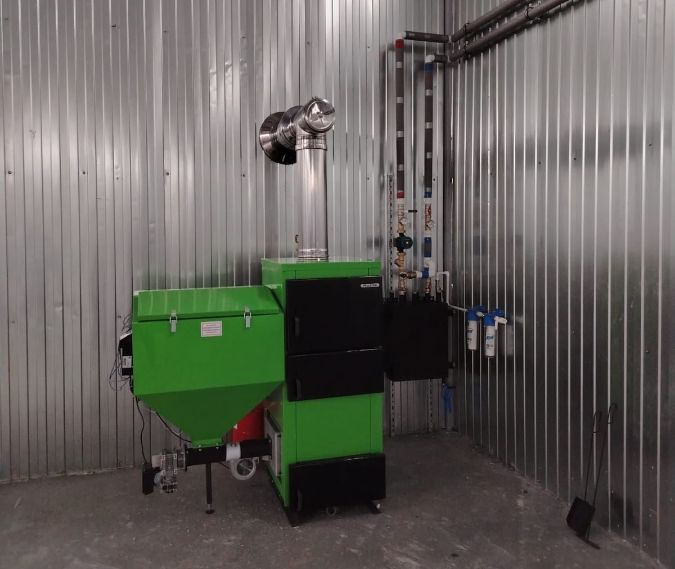 В рамках организации надежной системы отопления был установлен пеллетный котел «Pelletor» мощностью 50 кВт. Для эффективного распределения тепла по помещению используются 2 тепловентилятора «Волкано». Отвод продуктов сгорания обеспечивается через дымоход, протяженностью 6 метров, который смонтирован по торцу здания.